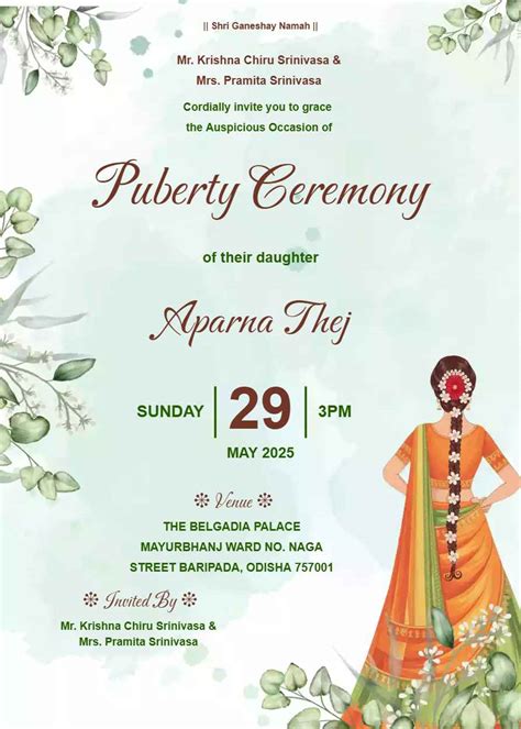 Puberty Function Invitation Message - From mature function cards to puberty function invitation online free options, our designs cater to every need. Online half saree invitation videos and e cards. Puberty function invitation card introducing our new half saree ceremony invitation template! Create free voni function, puberty ceremony, saree ceremony, mature function, saree function invite cards. Making half saree function video invite is simple with.